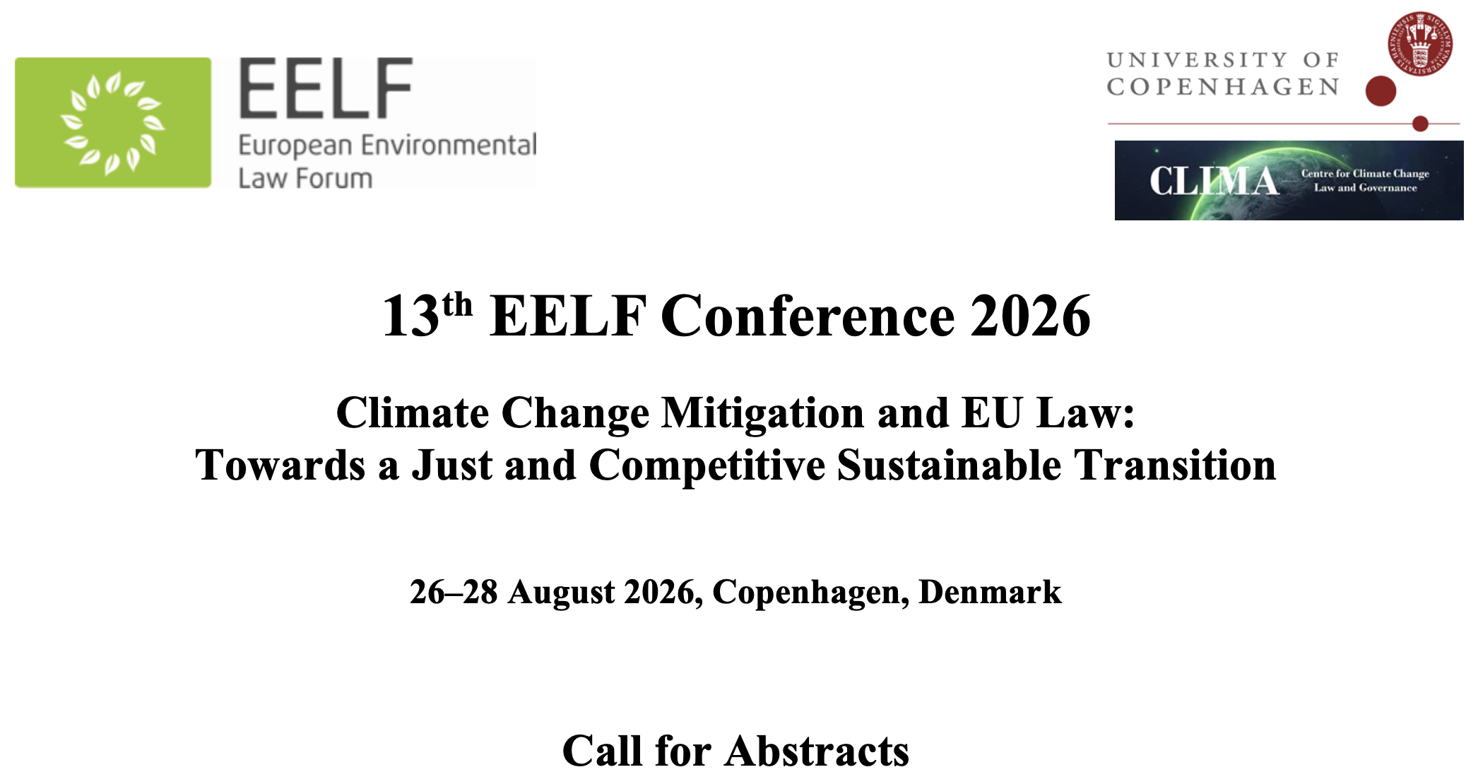 The Centre for Climate Change Law and Governance (CLIMA) at the University of Copenhagen is pleased to host the 13th European Environmental Law Forum (EELF) Conference 2026, on 26–28 August 2026 in Copenhagen, Denmark. The conference theme is “Climate Change Mitigation and EU Law: Towards a Just and Competitive Sustainable Transition.”